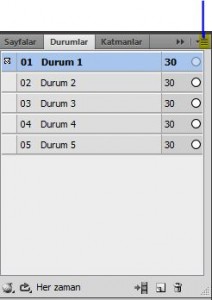 gif resmimiz için 400×120 ebatında bir çalışma alanı açalım ve dilediğimiz bir renk ile tuvali renklendirelim. Ben kendi adım olan AKİF yazısını gif resme dönüştüreceğim ve her karede adımın harflerinin teker teker gelmesini istiyorum, adım 4 harfli olduğundan ve bir durumda da hiç harf olmayacağından toplam 5 adet duruma ihtiyacım var. Menü çubuğundan Pencere sekmesinde Durumları işaretleyelim, durumlar penceresinde aşağıdaki resimde işaretli kısma tıklayalım ve buradan Durumları Çoğalt seçeneğini seçip Sayı kısmına 4 yazalım ve Geçerli Durumdan sonra seçeneğini seçelim. Böylelikle toplam 5 adet durumumuz oluştu.